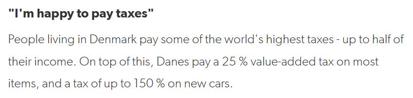 And regarding happiness, it takes no stretch of the imagination to see that not having to worry about how to pay for emergency healthcare and university education, for instance, would make any person less tense, nervous, or worried about their situation in life. And then given that, one could just focus on one’s family and job, making it all the more easy to thrive. Multiply this across an entire population and you have a recipe for a content, motivated, productive society. There are of course trade offs, as these “benefits” don’t pay for themselves. But relinquishing control of that part of their lives to the State is the mental calculus that Danes, at least reportedly, are happy to make. In fact, the Danes are happy about all sorts of stuff. I know because the Danish government says so.