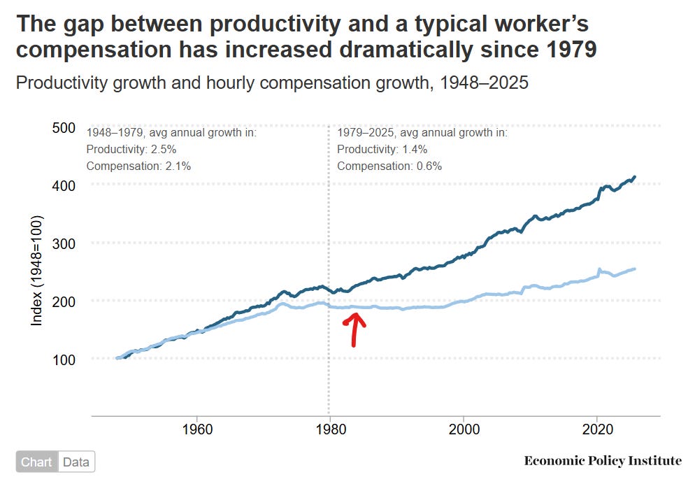 Once upon a time, Productivity and Pay levels were measured at 167.4 and 158 respectively – a Productivity-Pay gap of less than 6%. By the end of 1971, after President Nixon took America fully off the gold standard, the gap had risen to over 9 ½ %, and as stated, in early 1985 it had risen to a lofty level of almost 23%. Toward the end of 2025, the Productivity-Pay gap stood at over 62%.