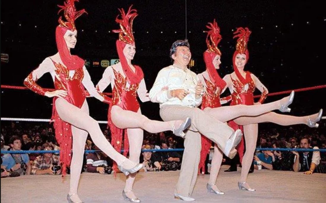 And the heavyweight championship, with a greased up Hulk Hogan, sweaty Mr. T, guest ring announcer former Yankees second baseman-and-soon-to-be-rehired-for-the-fourth-time manager Billy Martin, guest referee Muhammad Ali, and a mink coat-wearing Liberace line dancing with the fucking Rockettes or some shit? …