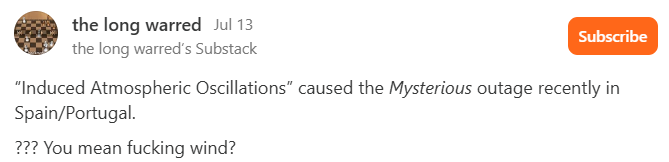 There are times it borders on ridiculousness. For instance, when Spain and Portugal lost power earlier this year, it wasn’t because of stupid energy policies and substandard electrical grids. Some blamed it on “Induced Atmospheric Oscillations.”